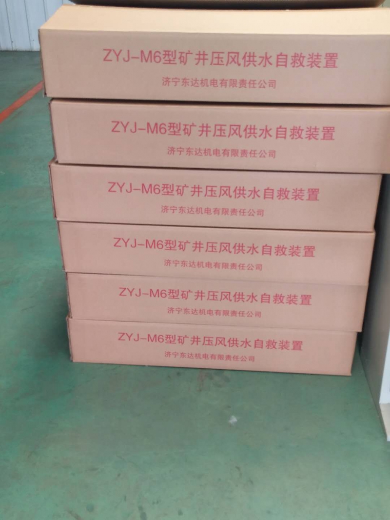 矿井压风自救供水装置ZYJ(C),本装置一箱六组(可根据要求设计组别),能同时提供六人使用,达到互相照顾的。该装置由箱体、安装板、进气管、进水管、净水过滤器、门锁、呼吸器(多组)、排水装置(多组)等组成。箱体、安装板、总进气管、总进水管采用不锈钢制造而成。