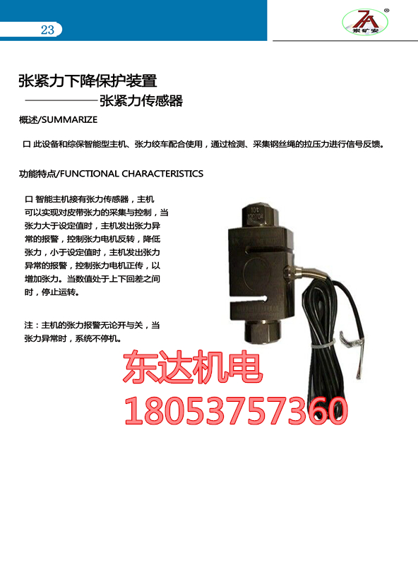 CSF-B带式输送机张紧力下降保护装置也叫柱式测压力和拉力装置,拉力 大可达30T,用来测钢丝绳的拉力保护皮带机的安全。如果矿上现在用的配重装置也可以用,把两个传感器圈穿过钢丝绳,张紧力输出的是0-10V的模拟量