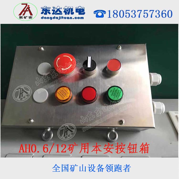 AH0.6/12矿用组合按钮箱内有接线端子,可以固定到机器上,也可以吊挂,外壳不锈钢,配套电动阀用,产品特点:是将矿用按钮集中在一起,操作方便。